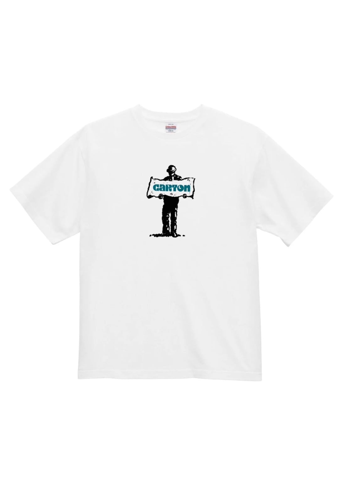 cartonを掲げる人物シルエットのグラフィックが印象的で、シンプルながら存在感のある一枚です。